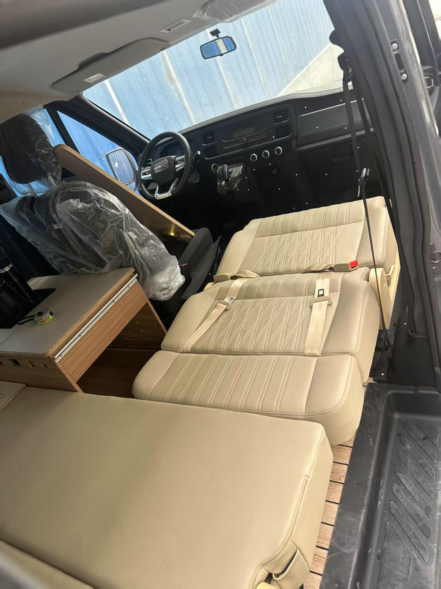 • 改装亮点:原车座椅、地板、内饰板全部更换,先做隔音止震,安装电池组。主驾更换为10项调节的电动座椅,副驾双人卡座和后排三人卡座升级,包裹性更好且能躺平翻转,底座内储放400AH锂电池及3000W逆变器。后车厢前端有可烧水可办公小桌,卡座展开后是一张1.85米的大床。