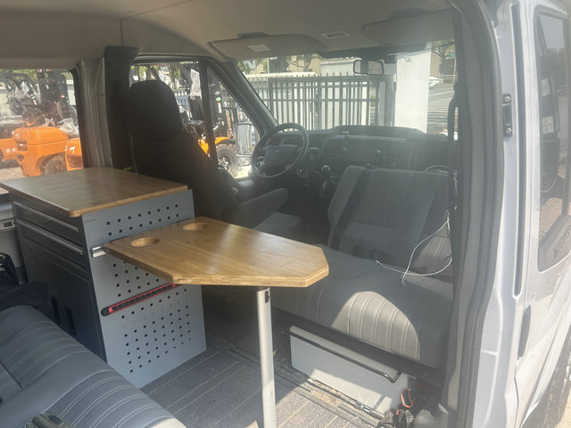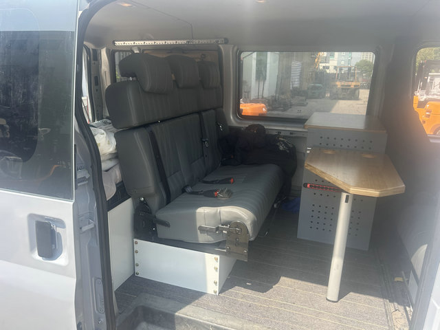 5.车尾有自己开发的魔盒(可出摊 4人对坐和标准自带1.24 米X175 的床或拼成1.9米*1.4米的大双人床配合中坐床 一家三口可宿营)